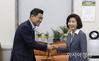 나경원 자유한국당 원내대표와 오신환 바른미래당 원내대표가 26일 국회 자유한국당 원내대표실에서 만나 인사를 나누고 있다./윤동주 기자 doso7@ |