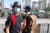 붉은 리본을 팔에 묶은 홍콩 의용군이 27일 오후 위안랑 역사 인근에 등장했다. [사진=입장신문] |
