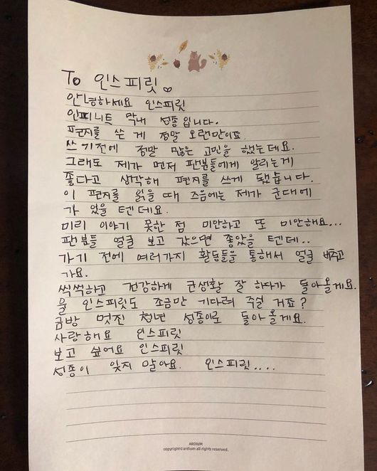 마지막으로 그는 "금방 멋진 청년 성종이로 돌아올게요. 사랑해요 인스피릿. 보고 싶어요 인스피릿. 성종이 잊지 말아요 인스피릿"이라며 팬들에게 인사를 건넸다.