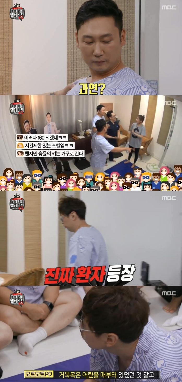 이후 이승윤은 현재 키를 측정했다. 167.6cm가 나오자 이승윤은 충격에 휩싸였다. 이승윤은 "사실 아까 작가님들이랑 재봤다. 168.1cm가 나오더라. 그런데 그 사이에 왜 줄었지?"라더니 "마사지 받고 얼굴 작아져서 사이즈가 줄었어"라며 지난주 방송에서 전파를 탔던 마사지에 대해 언급해 폭소를 자아냈다. 이어 '진짜 환자'인 모르모트PD가 등장해 척주 교정 및 어깨 도전을 시작했다.