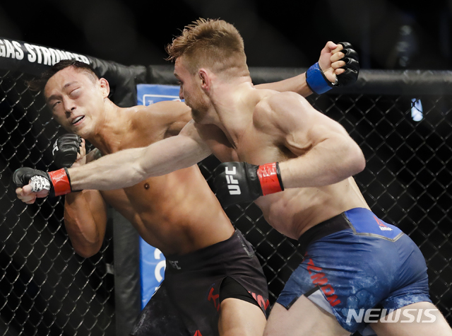 【뉴어크=AP/뉴시스】마동현(왼쪽)이 3일(현지시간) 미 뉴저지주 뉴어크 프루덴셜 센터에서 열린 'UFC on ESPN' 158파운드 계약 체중 경기에서 스콧 홀츠먼(미국)과 경기하고 있다.