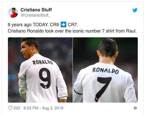 2009년 레알 마드리드 이적 후 호날두는 9번으로 등번호를 바꿀 수밖에 없었다. 팀에 레전드 라울이 이미 7번을 달고 있었기 때문. 하지만 라울이 이듬해 이적하면서 호날두는 다시 7번으로 갈아탈 수 있었다. 2010년 8월 4일 정확하게 9년 전 벌어진 일이다.