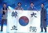 뮤지컬 ‘영웅’에서 주인공들이 단지 후 혈서로 ‘대한독립’이라고 쓴 태극기를 들어 보이는 장면. 세계일보 자료사진 |