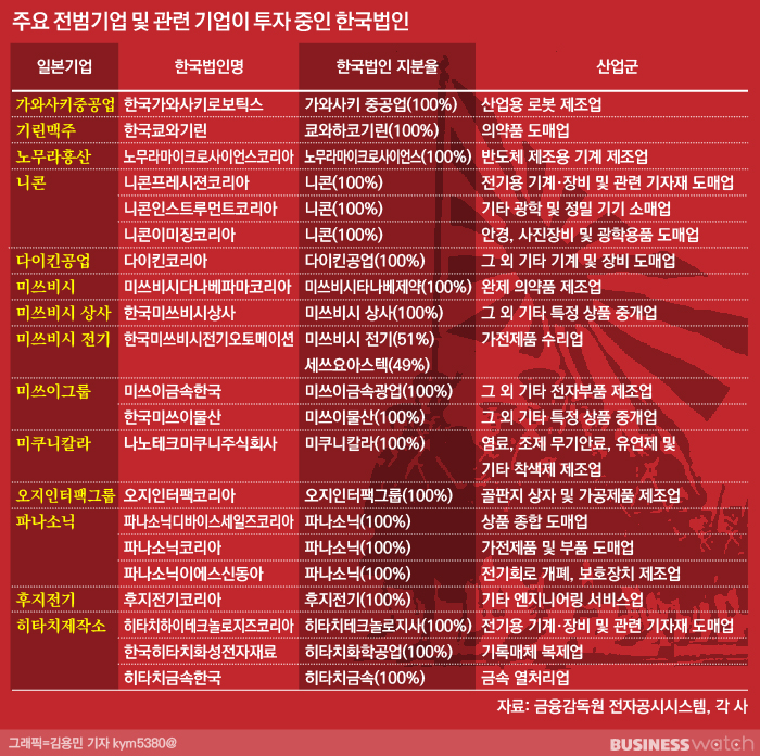 대표적으로 ▲오지인터팩코리아 ▲후지전기코리아 ▲한국미쓰비시상사 ▲니콘프레시전코리아 ▲미쓰이금속한국 ▲히타치금속한국 ▲파나소닉코리아 ▲미쓰비시다나베파마코리아 등입니다.