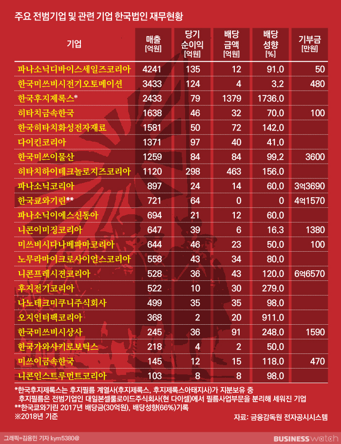 지난해 일본 전범기업 및 관련 기업의 한국법인 23개사는 총 2조5534억원의 매출을 올렸습니다. 순이익은 1434억원을 거둬들였는데요. 가장 많이 매출을 올린 곳은 전자제품에 들어가는 소재 및 부품 도매업체인 '파나소닉디바이스세일즈코리아'로 지난해 4241억원의 매출을 올렸습니다.