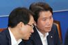 더불어민주당 이인영 원내대표(오른쪽)와 이원욱 원내수석부대표가 6일 오전 국회 원내대표회의실에서 열린 원내대책회의-상임위간사단 연석회의에서 이야기하고 있다.(사진=연합뉴스) |