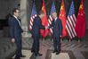 중국의 류허(오른쪽) 부총리가 지난달 31일 중국 상하이의 시자오(西郊)빈관에서 미국측과 무역협상에 들어가기 전 로버트 라이트하이저 미 무역대표부(USTR) 대표와 악수를 나누고 있다. 왼쪽은 스티븐 므누신 미 재무장관. 베이징 AP=연합뉴스 |