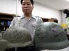 2004년 8월 육군사관학교에서 열린 신형방탄헬멧 성능비교시험에서 김희재 육사무기공학과 교수가 새로 개발한 국산 방탄헬멧(오른쪽)과 미군헬멧의 실험결과를 보여주고 있다. 이 장비가 현재 군에 보급돼 있는 제품이다. 연합뉴스 |