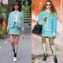 해당 의상을 입은 모델은 독특한 프레임의 선글라스와 진주 목걸이, 지브라 패턴 레깅스와 체크 패턴 롱부츠 등을 매치했다. 재킷 위에는 고양이 모양의 커다란 패치를 달았다.