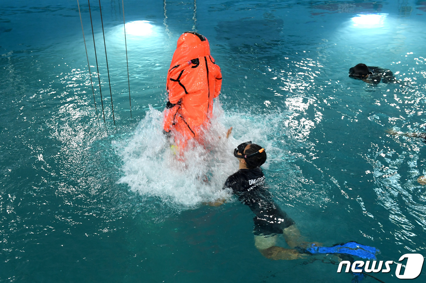 지난 13일 잠수함 비상탈출훈련장에서 탈출복을 입은 잠수함승조원이 수심 10m 아래에 있는 가상의 잠수함 해치를 열고 탈출, 수면 위로 떠오르고 있다. (잠수함사령부 제공) 2019.8.14/뉴스1photo@news1.kr[© 뉴스1코리아(news1.kr), 무단 전재 및 재배포 금지]