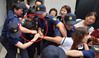 전 남편 살해 혐의로 구속기소 된 고유정(붉은 원내)이 12일 오전 제주지법에서 첫 재판을 받고 나와 호송차에 오르기 전 한 시민에게 머리채를 잡히고 있는 모습. [연합] |