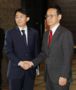 김정한 외교부 아시아태평양국장(왼쪽)이 지난달 5일 도쿄 외무성 청사 현관에서 맞이하러 나온 가나스기 겐지(金杉憲治) 일본 외무성 아시아대양주국장과 악수하고 있다./연합뉴스 |