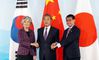 21일 중국 베이징 구베이수이전에서 '제9차 한·중·일 외교장관 회의'가 열리는 가운데 강경화 외교부 장관과 왕이 중국 외교 담당 국무위원 겸 외교부장, 고노 다로 일본 외무상이 회담에 앞서 기념촬영을 하고 있다. 베이징 특파원 공동취재단 |
