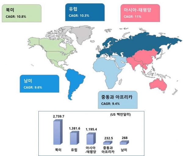 2017년 지역별 유전자검사 시장규모. 출처=모도 인텔리전스 현재 유전자 검사 시장은 미국과 캐나다 등 북미 지역이 약 47%의 점유율을 차지하며 주도하고 있다. 선진 의료 기술 도입과 유전자 검사에 대한 환자들의 인식 개선이 시장 발전에 크게 기여한 것으로 분석된다.