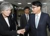 강경화 외교부장관이 26일 국회를 방문 윤상현 외통위원장과 '한일군사정보보호협정'(GSOMIA·지소미아) 관련 이야기를 나누고 있다. 사진=박범준 기자 |