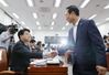 홍영표 정개특위 위원장(오른쪽)과 장제원 자유한국당 간사가 26일 국회에서 열린 정치개혁 특별위원회 전체회의에서 악수하고 있다. 김경록 기자 |