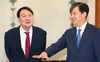윤석열 검찰총장(왼쪽)이 지난달 25일 청와대에서 문재인 대통령한테 임명장을 받기 전 당시 조국 민정수석비서관과 만나 대화하고 있다. 연합뉴스 |