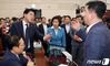 국회 정치개혁특별위원회가 패스트트랙에 올라있는 공직선거법 개정안을 29일 의결했다. 한국당 나경원 원내대표(왼쪽 세 번째)와 장제원 한국당 의원(왼쪽 두 번째)이 홍영표 정개특위 위원장(왼쪽 첫 번째) 앞으로 뛰쳐나와 항의하고 있다. 이날 한국당 의원들은 정개특의 의결에 대해 "역사의 죄인"이라며 비판했다. 뉴스1 |
