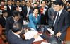 29일 국회 정치개혁특별위원회에서 홍영표(맨 왼쪽) 위원장이 선거법 개정안을 의결하자 자유한국당 나경원(가운데) 원내대표, 장제원(오른쪽) 간사가 “날치기 통과”라며 항의하고 있다. /박상훈 기자 |