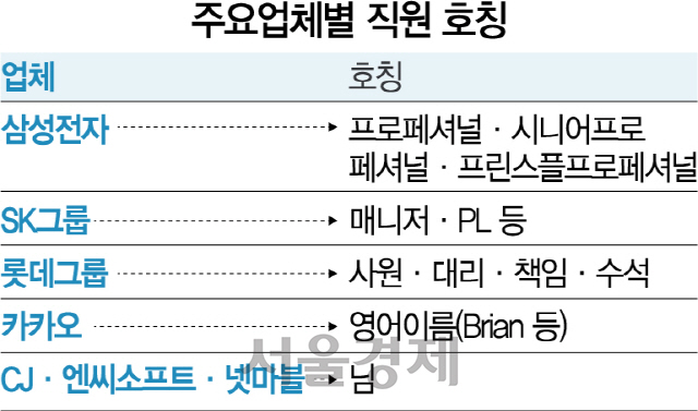 이 같은 호칭파괴 문화와 관련해 국내에서는 지난 2000년 1월 ‘님’ 제도를 처음 도입한 CJ를 선두주자로 꼽는다. SK텔레콤(017670)의 경우 2006년부터 매니저 호칭을 사용해왔으며 본부장·실장·팀장 등 직책을 가진 직원만 호칭을 달리한다. 삼성전자는 2년 전부터 7단계 직급을 4단계로 단순화하고 별도 직책이 없는 한 상대방을 ‘님’이나 ‘프로’ 같은 수평적 호칭으로 부른다. 실제 삼성전자 직원의 명함에는 직급별로 ‘프로페셔널(Professional)’ ‘시니어프로페셔널(Senior Professional)’ ‘프린스플프로페셔널(Principal Professional)’ 등이 새겨져 있다.