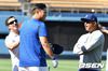 경기 전 훈련 때 다저스 류현진과 데이브 로버츠 감독, 앤드류 프리드먼 야구부문 사장이 그라운드에서 만나 대화를 나누고 있다. 이 자리에서 두 사람은 류현진에게 휴식을 결정했다는 이야기를 전했을 확률이 높다. /dreamer@osen.co.kr