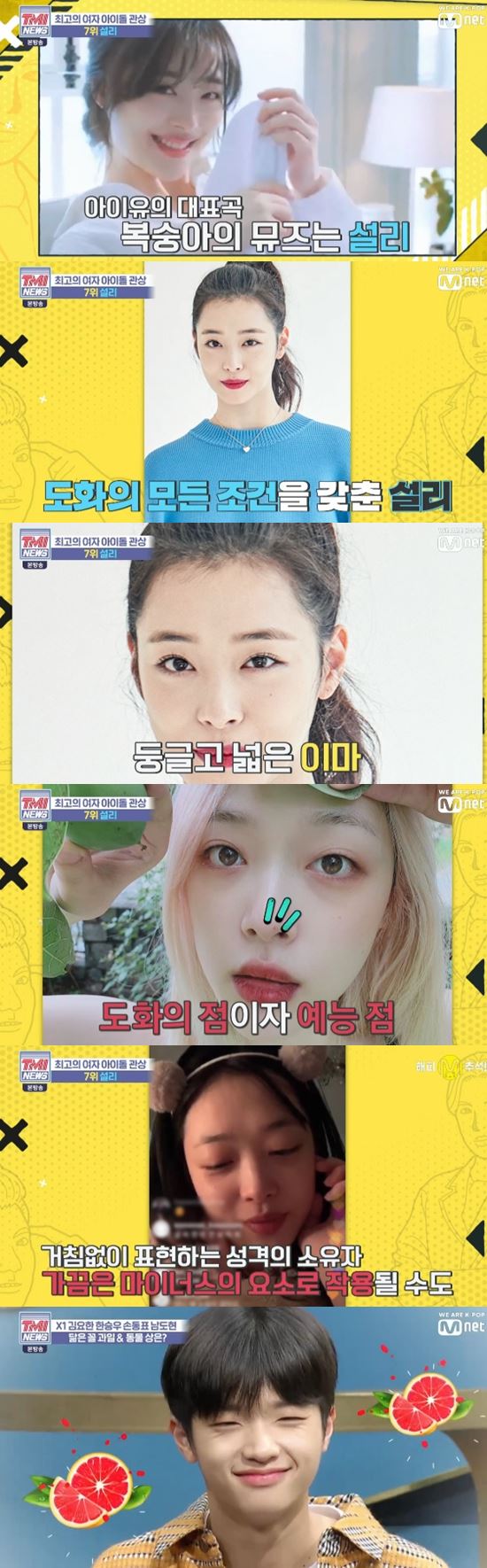 이날 'TMI뉴스'에서 최고의 남녀 아이돌 관상을 소개했다. 최고의 여자 아이돌 관상 7위는 '인간 복숭아'로 불리는 설리였다.
