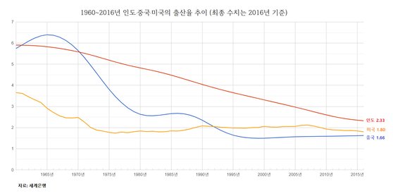UN의 ‘2019년 세계 인구 전망’(World Population Prospects 2019) 보고서에 따르면 올해 중국의 인구는 14억3378만명, 인도는 13억6642만명으로 양국 간 인구 격차는 6737만명까지 좁혀진 것으로 나타났다. 8년 후인 2027년이면 인도의 인구는 14억6934만명, 중국은 14억6180만명으로 인도가 중국을 역전한다. 인도의 출산율은 2.33명(2016년 기준)으로 여전히 2명 이상이 유지되고 있는 데 반해, 중국은 미국(1.80명)보다 낮은 1.62명까지 떨어진 여파다.