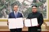 【평양=뉴시스】평양사진공동취재단 박진희 기자 = 문재인 대통령과 김정은 국무위원장이 19일 오전 평양 백화원 영빈관에서 평양공동선언문에 서명한 후 합의서를 들어보이고 있다. 2018.09.19. photo@newsis.com <저작권자ⓒ 공감언론 뉴시스통신사. 무단전재-재배포 금지.> |