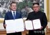 문재인 대통령과 김정은 국무위원장이 지난해 9월 19일 오전 평양 백화원 영빈관에서 평양공동선언문에 서명한 후 합의서를 들어보이고 있다. <사진=평양사진공동취재단> |