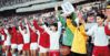 1990년 10월 23일 잠실주경기장에서 열린 통일축구대회 2차전이 끝난 뒤 만세를 부르는 남북 축구 선수들. /조선일보DB |
