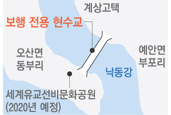 안동시는 2021년 준공을 목표로 도산면 동부리와 예안면 부포리를 잇는 길이 750m, 폭 2m의 보행 현수교 공사를 진행한다고 23일 밝혔다. 완성될 경우 현재 세계 최장 현수교보다 약 250m가 더 길 것으로 예상된다. 현수교는 교각과 교각을 철선 및 쇠사슬로 연결하고 다시 상판을 매어다는 형태로 만든 교량이다.
