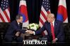 문재인 대통령이 23일(현지시간) 뉴욕 인터콘티넨탈 뉴욕 바클레이 호텔에서 도널드 트럼프 미국 대통령과 한미 정상회담을 하고 있다. 한미 정상은 정상회담에서 한반도의 항구적인 평화 체제 구축 의지를 재확인했다. /청와대 제공 |