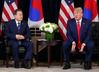 [뉴욕=아시아경제 황진영 기자] 도널드 트럼프 미국 대통령이 23일(현지시간) 뉴욕에서 문재인 대통령과 정상회담을 하면서 기자들의 질문에 혼자 답변을 해 외교 결례 논란이 벌어지고 있다.