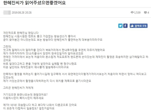 이어 “안쪽에서 촬영하려는지 내부로 들어가길래 입구 쪽에 서서 멍하니 쳐다보고 있었는데, 내가 서 있는 곳에서 촬영을 시작하려는지 다시 위치를 내 쪽으로 옮겼다”며 “그리곤 한혜진씨가 내게 ‘거기 있으면 화면 나오는데 괜찮겠어요? 이동하시든지 빠지든지 해주세요’라고 했다”고 적었다.