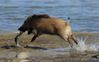 멧돼지 한 마리가 숭어를 문 채 힘차게 도약하고 있다. 연합뉴스 |