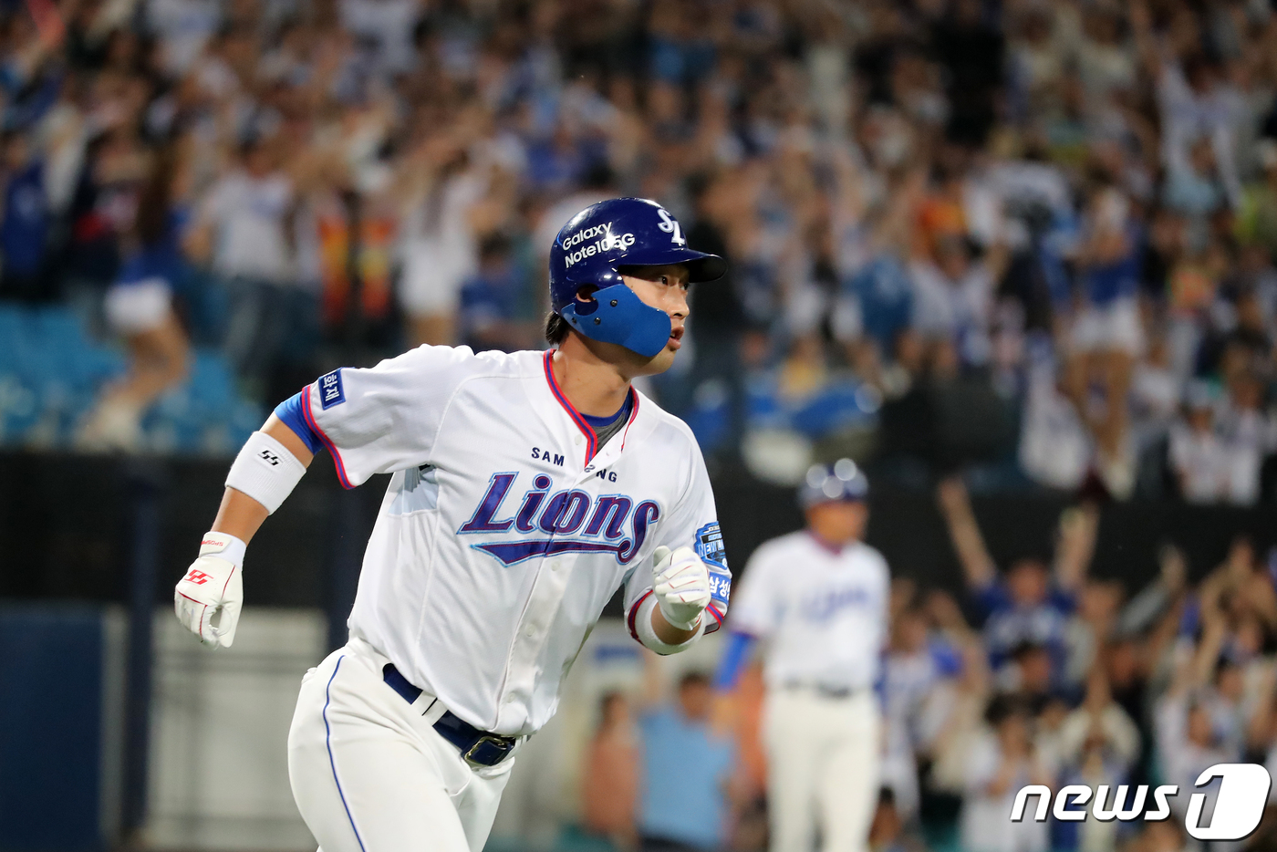 (대구=뉴스1) 공정식 기자 = 28일 오후 대구삼성라이온즈파크에서 열린 프로야구 '2019 신한은행 마이카 KBO리그' 삼성 라이온즈와 SK 와이번스의 경기, 10회말 1사 1루 상황 삼성 2번타자 이학주가 SK 정영일을 상대로 우측 담장 넘어가는 끝내기 투런홈런을 때린 뒤 베이스를 힘차게 돌고 있다. 2019.9.28/뉴스1