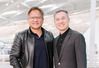 하현회 LG유플러스 부회장(오른쪽)이 엔비디아 젠슨 황 창업자 겸 CEO와 엔비디아 사옥에서 기념촬영했다. |