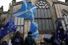 Protesters holding Scottish and European flags gather in front of St Gilles Cathedral facing the Scottish Court of Session in Edinburgh, Scotland, Wednesday, Sept 4, 2019. A Scottish court says British Prime Minister Boris Johnson's planned suspension of Parliament is lawful. The closely watched decision was revealed Wednesday. It is the first of several challenges to Johnson's maneuver that gives lawmakers little time to prevent Britain from crashing out of the European Union without an agreement on Oct. 31. (AP Photo/Francois Mori) /뉴시스/AP /사진= |