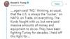 로이터는 이날 트윗과 관련해 "트럼프는 지원에 비용이 너무 많이 든다면서 수년에 걸친 IS와의 전쟁에서 미군과 함께 싸운 쿠르드족 전사들을 포기했다"고 전했습니다.