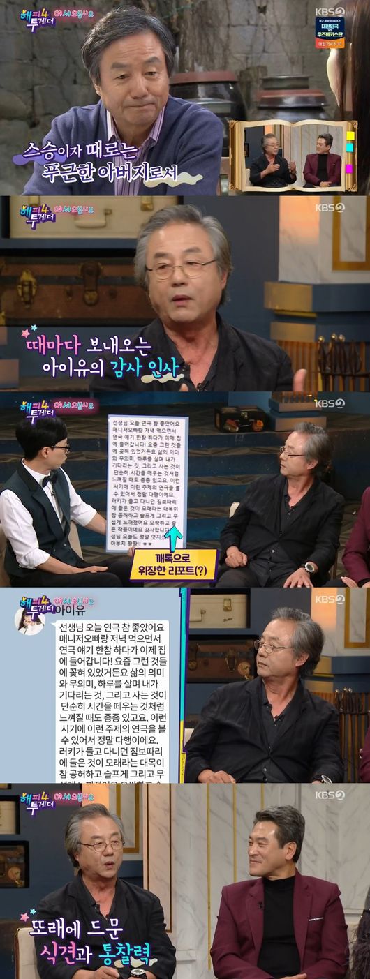 정동환이 아이유 하나 믿고 출연했다는 말에 아이유는 "감동이다"면서 캐스팅비화를 알고 깜짝 놀랐다. 각별한 인연에 대해 아이유는 "첫 주연작이 '최고다 이순신' 부녀 역할로 처음만나, 연기하면서 너무 진심이 됐다"면서 "드라마 끝날 때까지 눈물 연기 있으면 사진을 띄어놓고 했다"면서 인생의 조언자이자 한결같은 연기스승이라 했다. 정동환은 아이유 말을 들으면서 애틋한 마음이 든 듯 눈가가 촉촉해졌다.