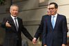 미중 무역협상을 위해 미국 워싱턴에 온 류허(왼쪽) 중국 부총리가 10일(현지시간) 미국 측 협상 대표인 로버트 라이트하이저(오른쪽 뒤)와 스티븐 므누신 미국 재무장관과 함께 협상장에 들어서고 있다. (사진=AFP제공) |