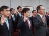 여환섭 대구지검장(앞줄 가운데)이 11일 대구고검에서 열린 국회 법제사법위원회 국정감사에서 선서하고 있다. | 박태우 기자 |