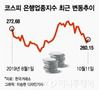 13일 한국거래소에 따르면 10월 둘째주(7~11일) 코스피 은행업종지수는 전주 대비 2.3% 하락한 260.15에 거래를 마쳤다.