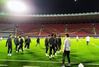 14일 평양 김일성경기장에서 인조잔디를 밟아오는 축구대표팀 선수들. |