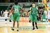 원주 DB가 새로 구축한 신 동부산성의 멤버 김종규(오른쪽)와 치나누 오누아쿠가 지난 6일 원주종합체육관에서 열린 전주 KCC와의 경기에서 득점한 뒤 서로 격려하고 있다. 제공|KBL |