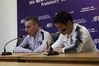14일 평양 김일성 경기장에서 인터뷰하는 파울루 벤투 감독(왼쪽) |