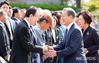 【창원=뉴시스】배훈식 기자 = 문재인 대통령이 16일 경남 창원시 마산합포구 경남대학교에서 열린 제40주년 부마민주항쟁 기념식에 참석하며 문정수 부산민주항쟁기념사업회 이사장과 인사를 나누고 있다.