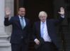 보리스 존슨 영국 총리가 9일 아일랜드를 방문해 더블린 정부청사에서 리오 버라드커 아일랜드 총리를 만나 함께 손을 흔들고 있다. /AP연합뉴스 |