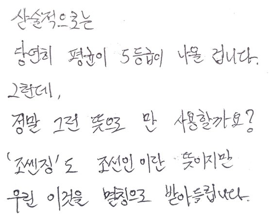 물론 비하성 발언이라는 지적 역시 있었습니다. 한 학생은 "산술적으로는 당연히 평균 5등급이 나올 겁니다. 그런데, 정말 그런 뜻으로만 사용할까요? '조센징'도 조선인이란 뜻이지만 우린 이것을 멸칭으로 받아들입니다"고 적었고요. 서울대 의예과 재학생 황지후(20)씨는 "'국민 개돼지 발언'과 비슷한 맥락인 것 같은데 다수의 반응이 자신의 생각과 다르거나 납득이 안갈때 사용되는 걸 봤다"며 "이 단어를 사용하는 건 '팩트제시' 목적이 아니라 '비하'를 정당화하는 것으로, 위험한 발언"이라고 꼬집었습니다.