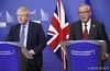【브뤼셀=AP/뉴시스】보리스 존슨 영국 총리(왼쪽)와 장 클로드 융커 유럽연합(EU)집행위원장이 17일(현지시간) 벨기에 브뤼셀 EU 본부에서 기자회견을 열어 브렉시트안 합의에 관해 발표하고 있다. 2019.10.17 |